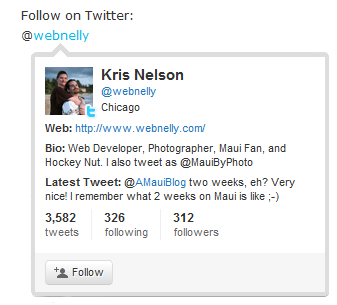 So, when I came across this simple how-to from TwiTip, I went right at it. And, in just a matter of moments, references to my Twitter accounts @webnelly and @MauiByPhoto had neat interactive hovercards. All I needed to do was follow the instructions in that post to setup my a new @anywhere application for my website and install the Twitter Anywhere Plus plugin for WordPress. And that was it.